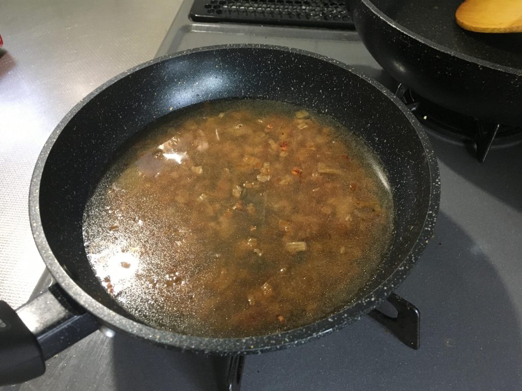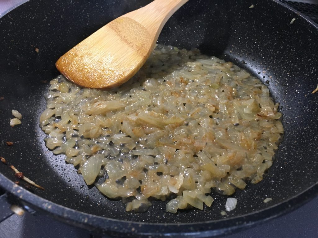 ①タマネギを粗みじんに切り、サラダ油を引いたフライパンであめ色になるまで30~40分炒める。