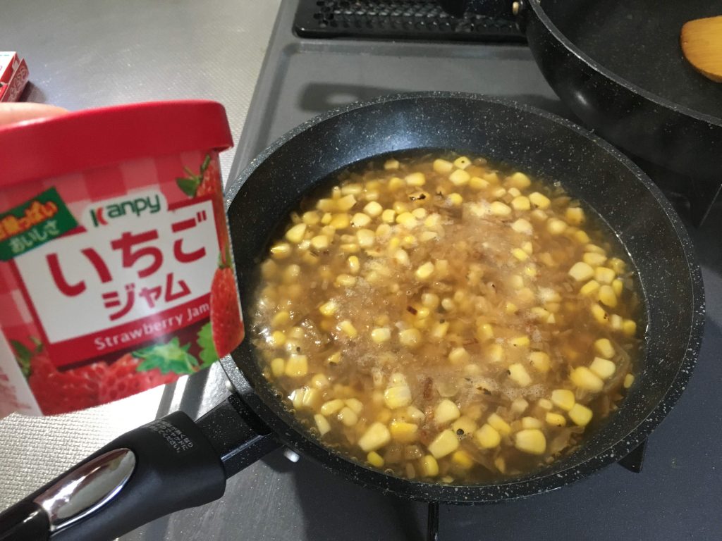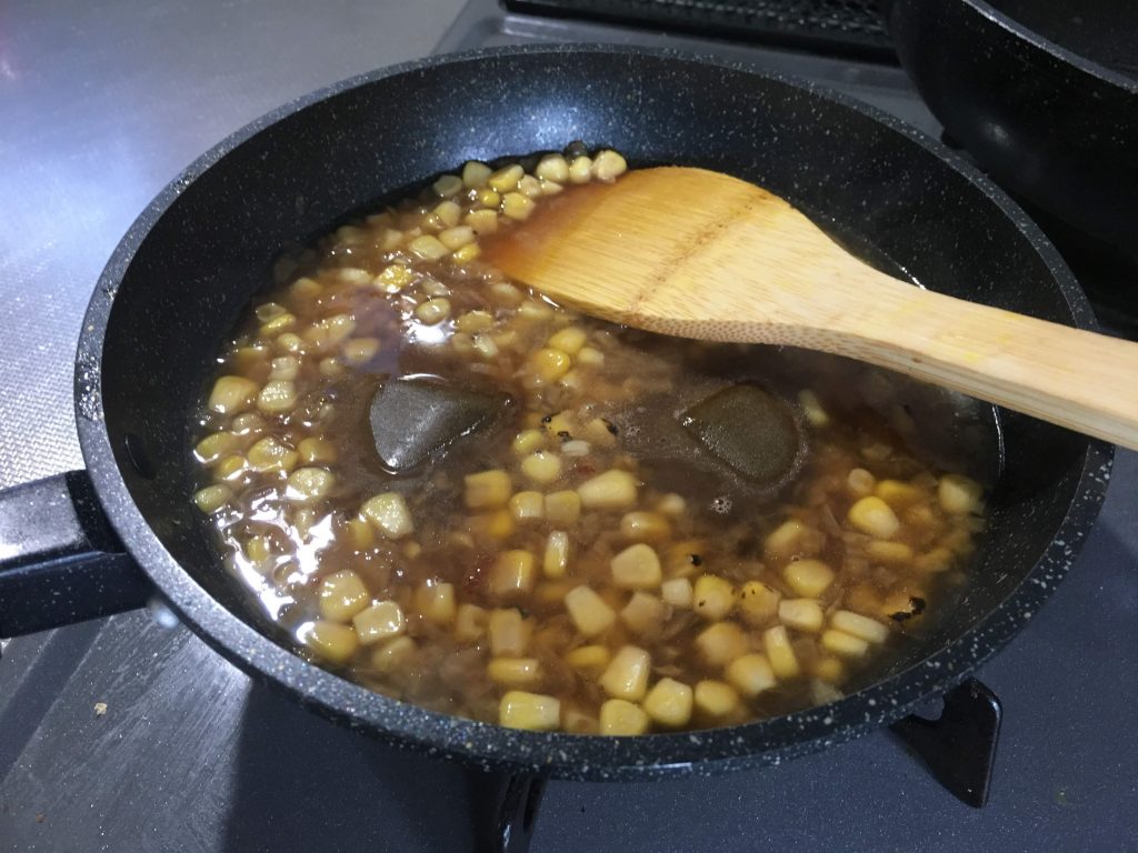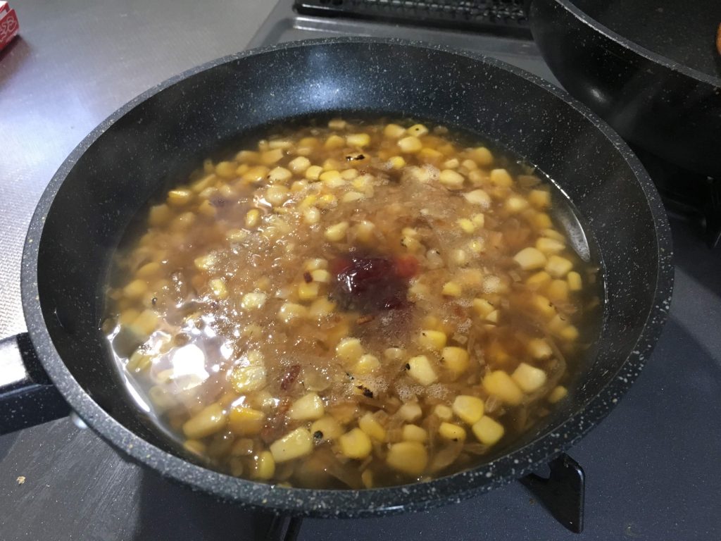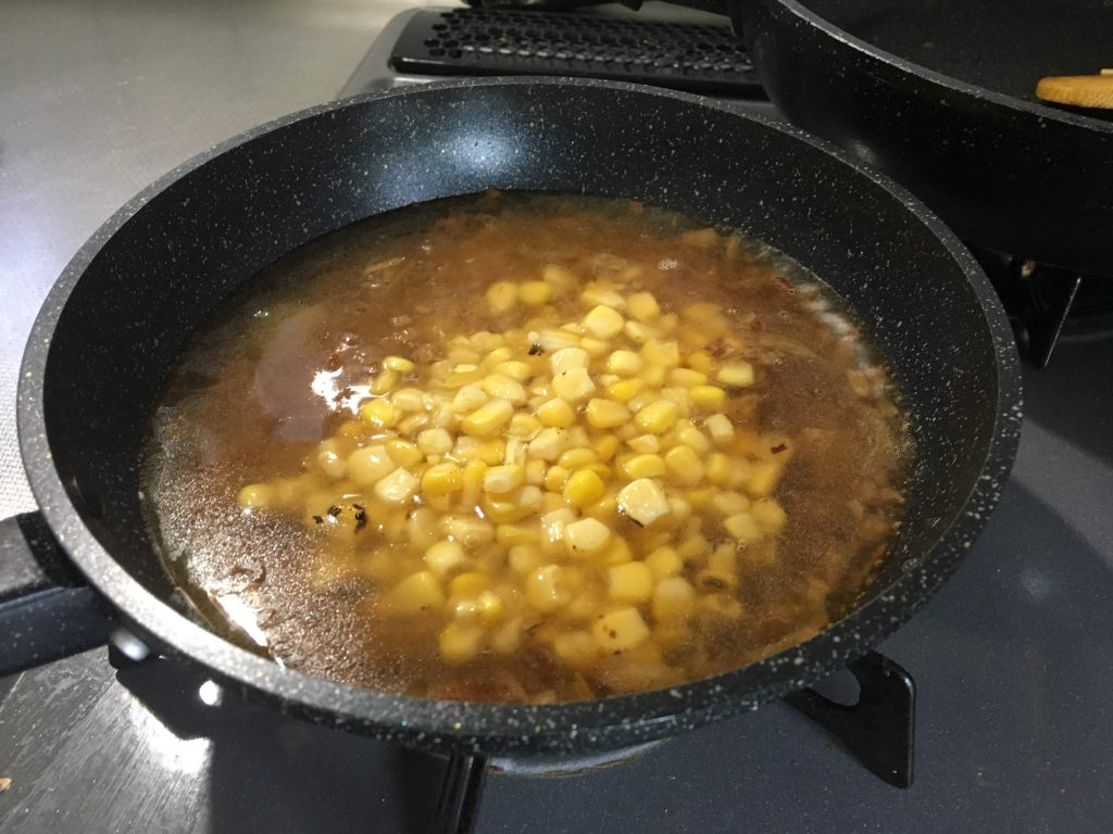 ②だし汁を入れひと煮立ちした後、コーンを入れ火を通す。(今回はコーンを入れる前にバーナーで焼き色を付けた)