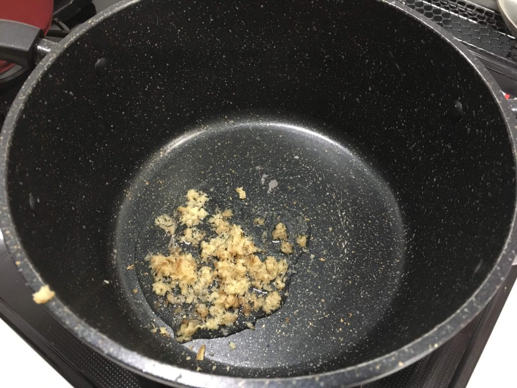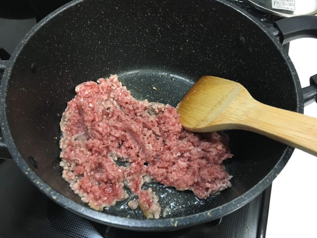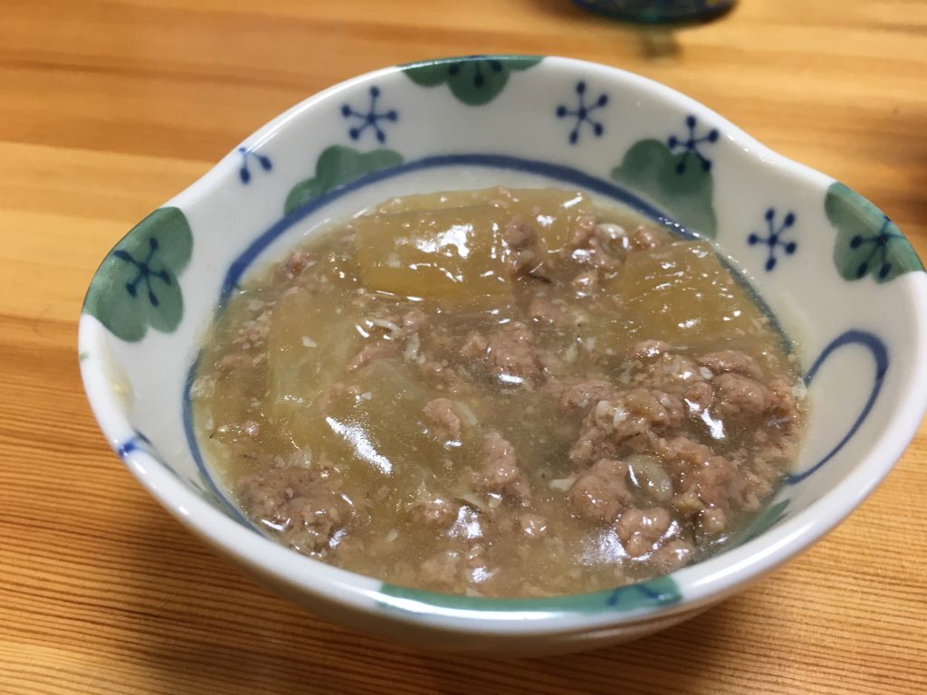 ②鍋にサラダ油をひき、すりおろした生姜とひき肉を炒め、ある程度火が通ったら混ぜ合わせた調味料(味噌、みりん、酒、醤油、鶏がらスープの素、水)を入れて、大根を入れ弱火で煮込んでいく