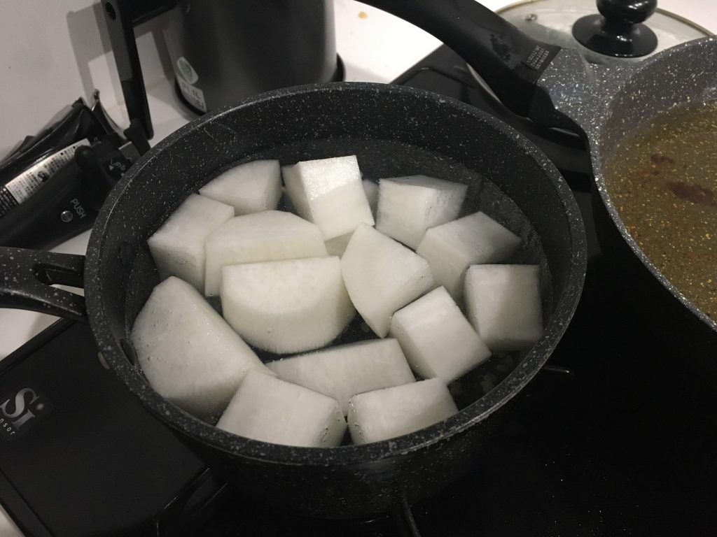 ①大根を下茹でする(米を適量入れて)。ゆで卵を作る