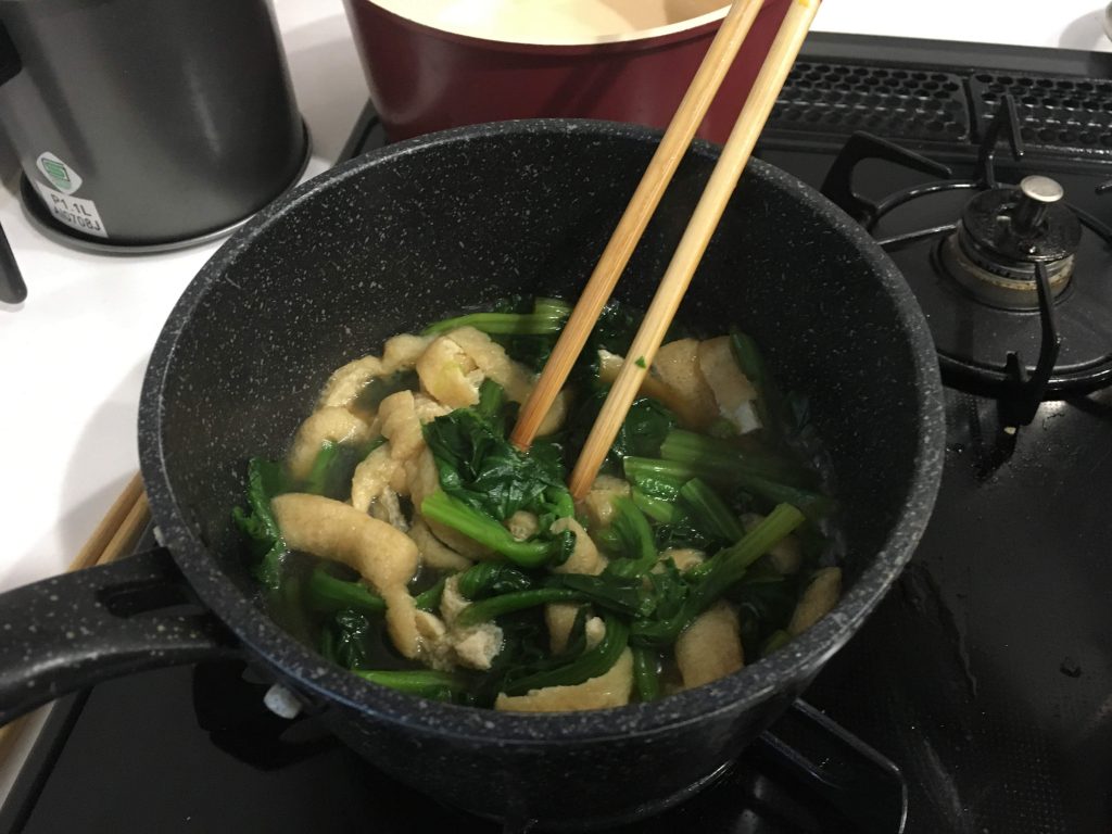 ③鍋に水150ml、醤油、みりん、カットした油揚げを入れひと煮立ちさせたあと、ほうれん草を入れ2=3分煮込む