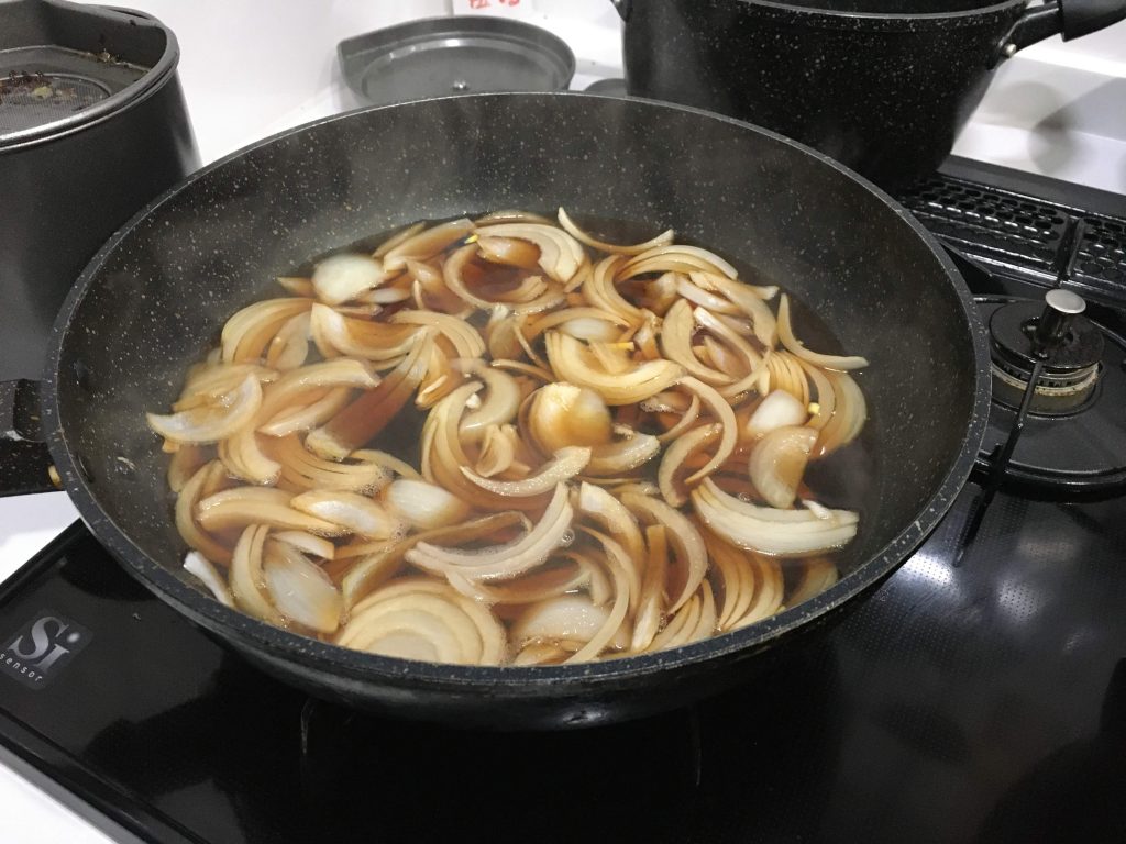 ④調味料をすべてフライパンに入れ、切った玉ねぎに火を通す