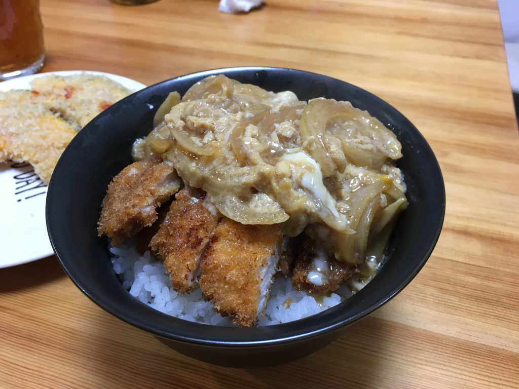 ⑧半熟になったら1/4ずつカツの上にかけていく