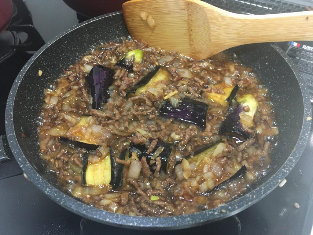 ⑤合わせ調味料を入れ、ふつふつしてきたらナスを戻し入れ、人混ぜした後、およそ2分煮込んだら出来上がり