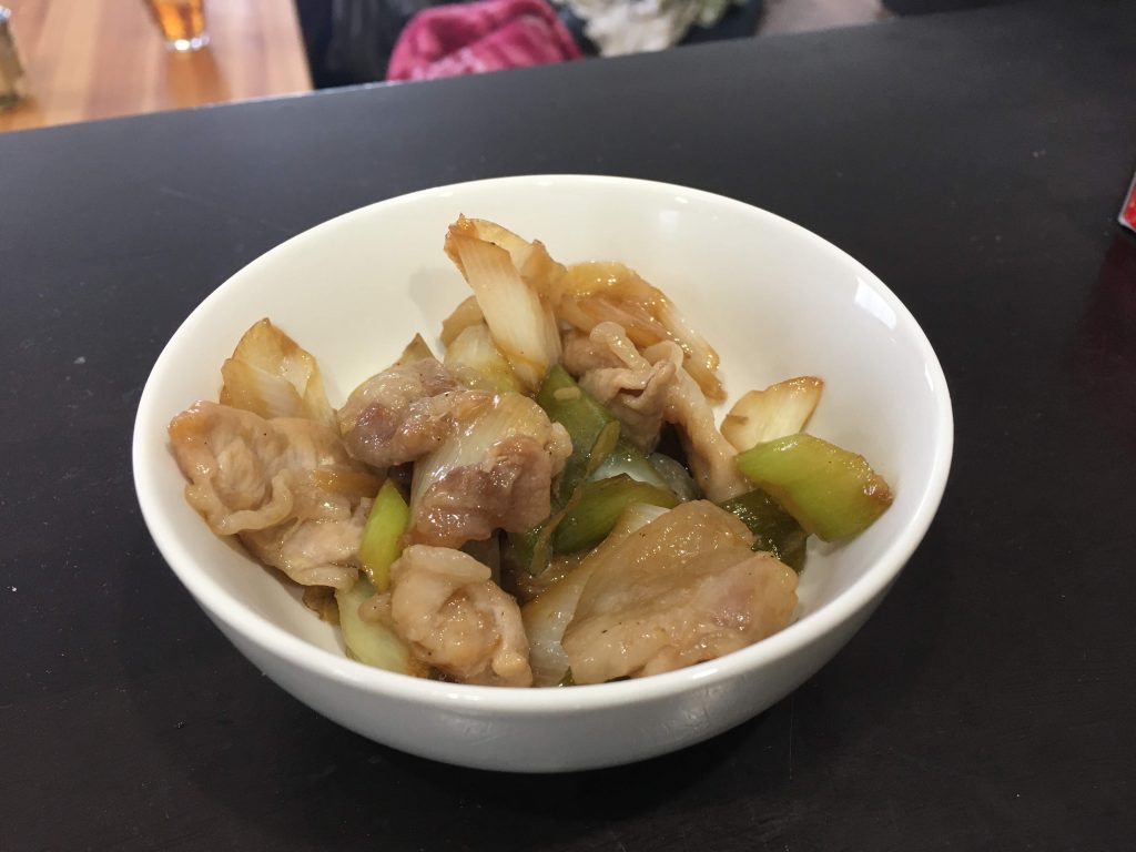 ②フライパンにごま油をひいて、長ネギを入れ、焼き目が付く直前で豚肉を入れ一緒に炒め、最後の方は蒸し焼きにする←ネギを蒸し焼きにすると甘みが増す。