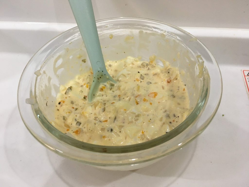 ②玉ねぎとゆで卵とマヨネーズと砂糖とピクルスとブラックペッパーを混ぜ合わせる(玉ねぎはしっかり水気をとる。ピクルスは?)