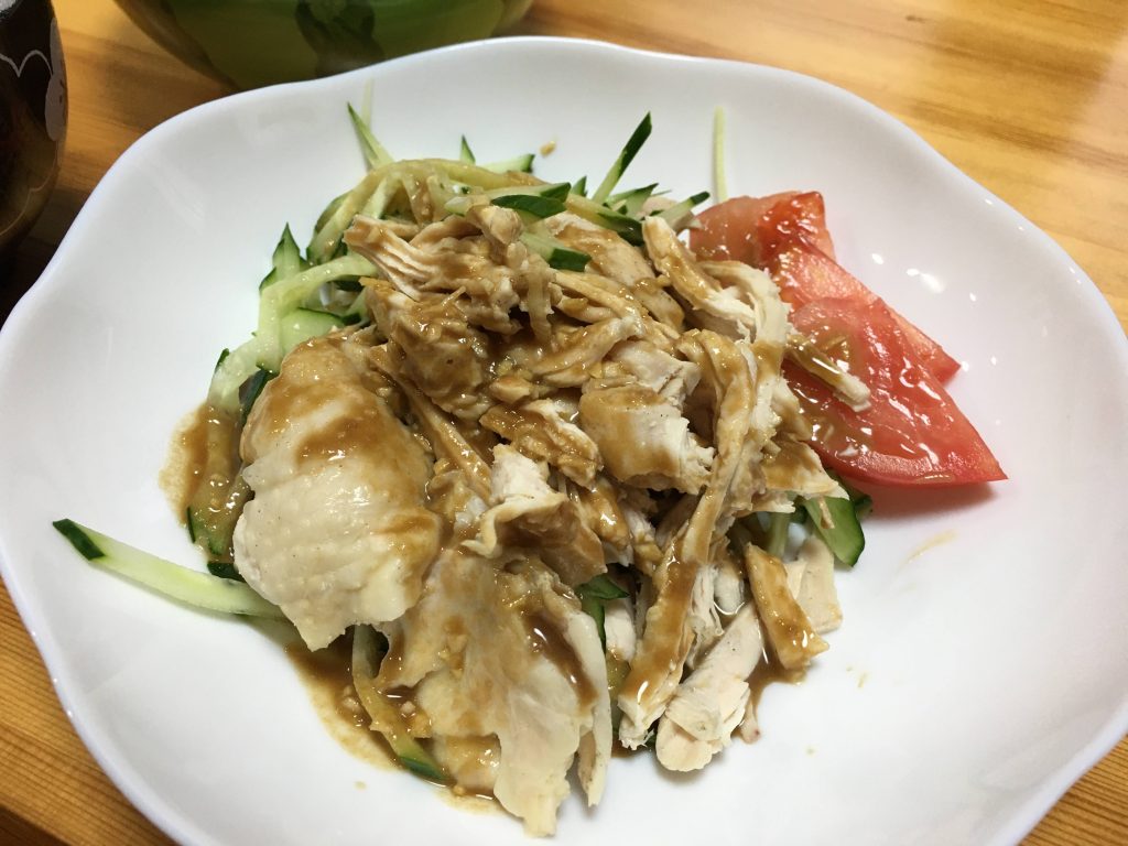 ④ 器に鶏肉をのせ、③をたっぷりかける。好みでトマトときゅうりを敷く。